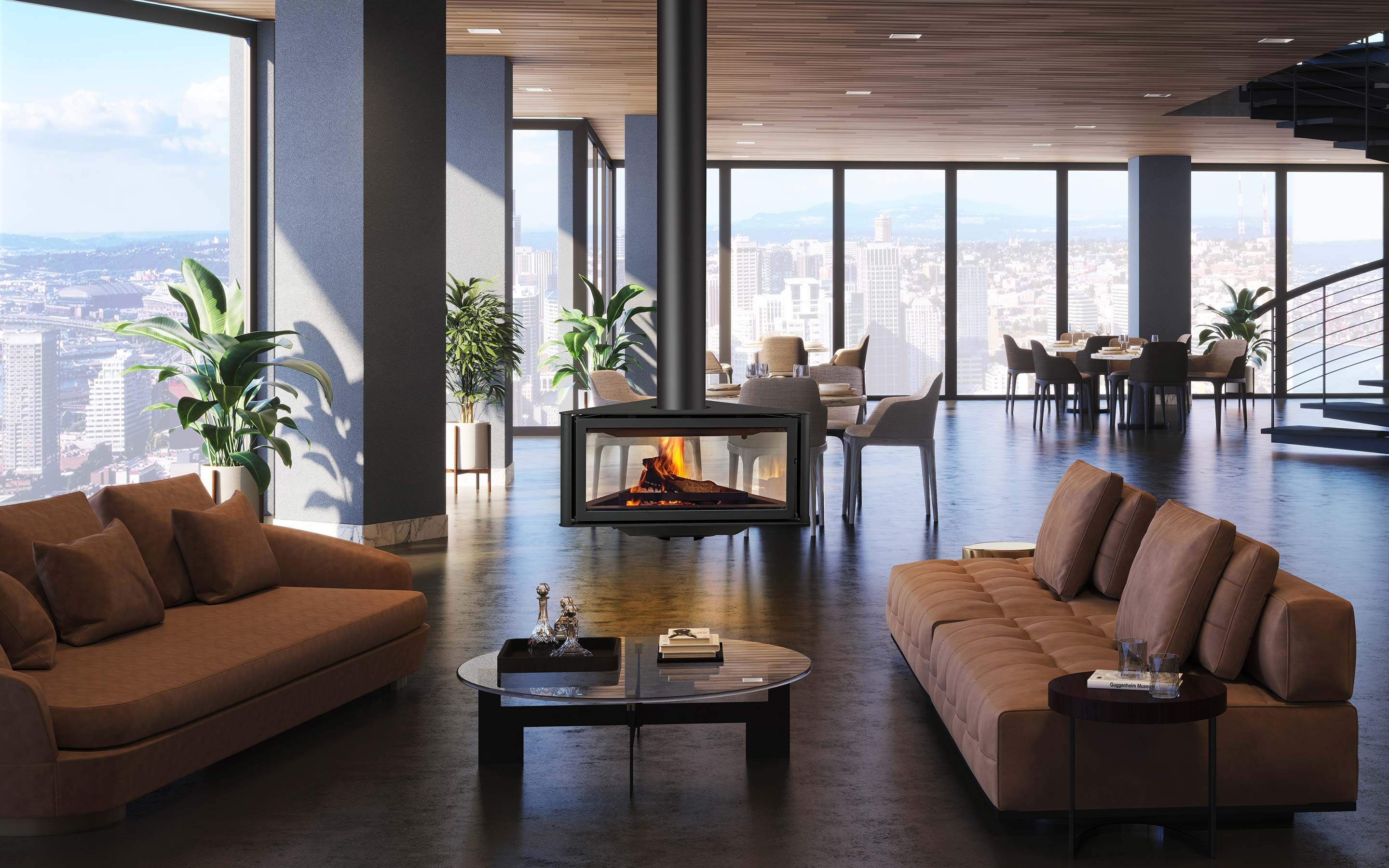 Chimenea metalica de tres caras, suspendida.